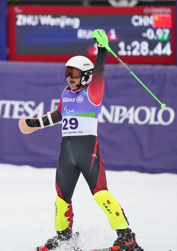 3月14日,米兰-科尔蒂纳冬残奥会高山滑雪女子回转(站姿)比赛在意大利科尔蒂纳举行。中国选手朱文静获得亚军。新华社记者 王楷焱 摄